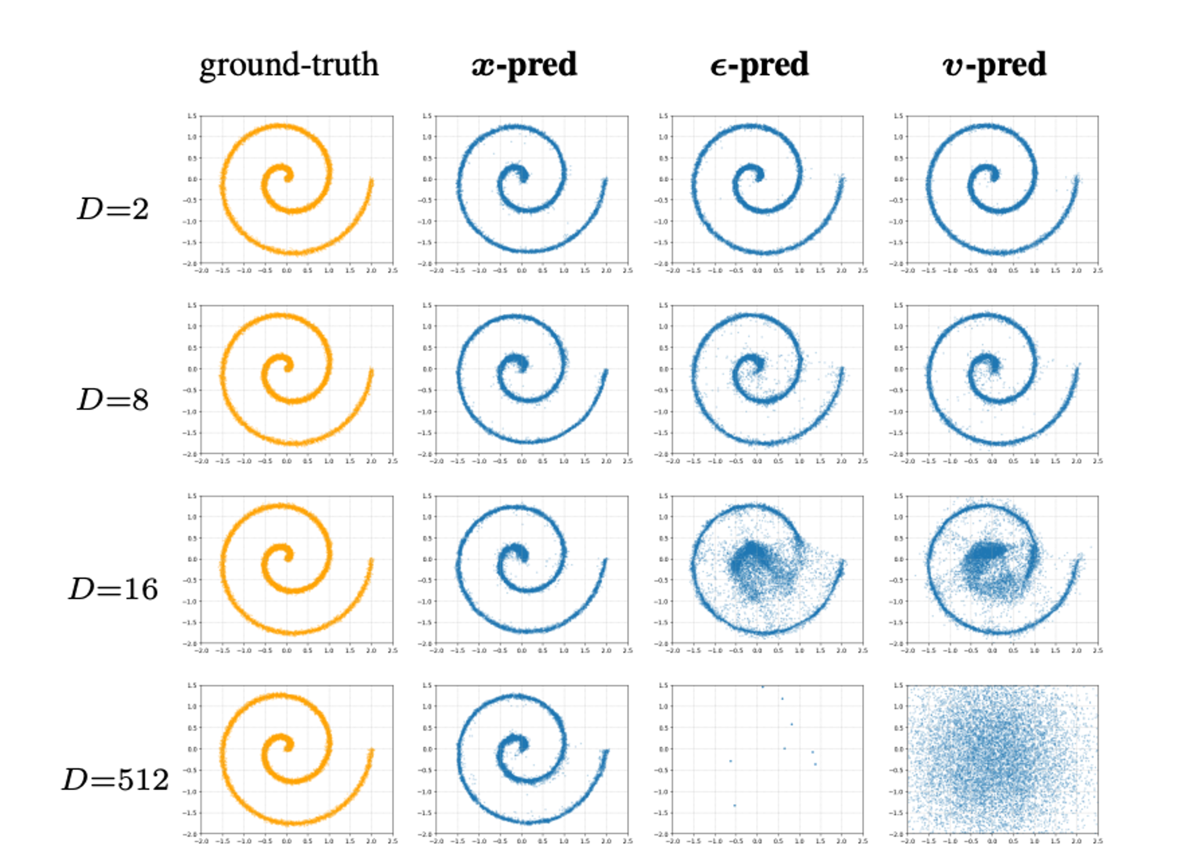 Enter back to basics: a recent paper that showed how, by training diffusion models to output velocity, we are effectively forcing them to learn noise. A flow matching model is trained on a target combining the input image and random noise. Actual images occupy a lower dimensional manifold in a high dimensional space (i.e. the space of actual images is of a lower dimensionality than the space of all possible images including RGB noise). If, per token, the model dim is 1024 and the image dim is 1200, the model has no chance at predicting the target. The paper shows what happens when you do this in a toy domain: