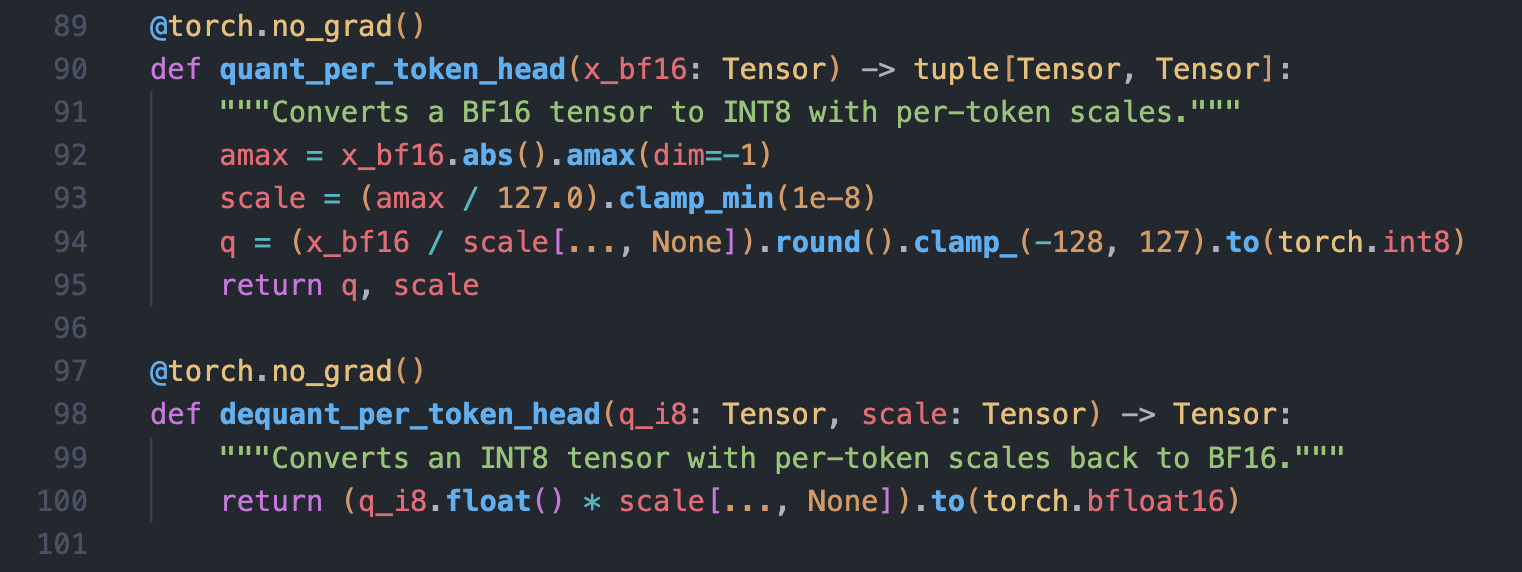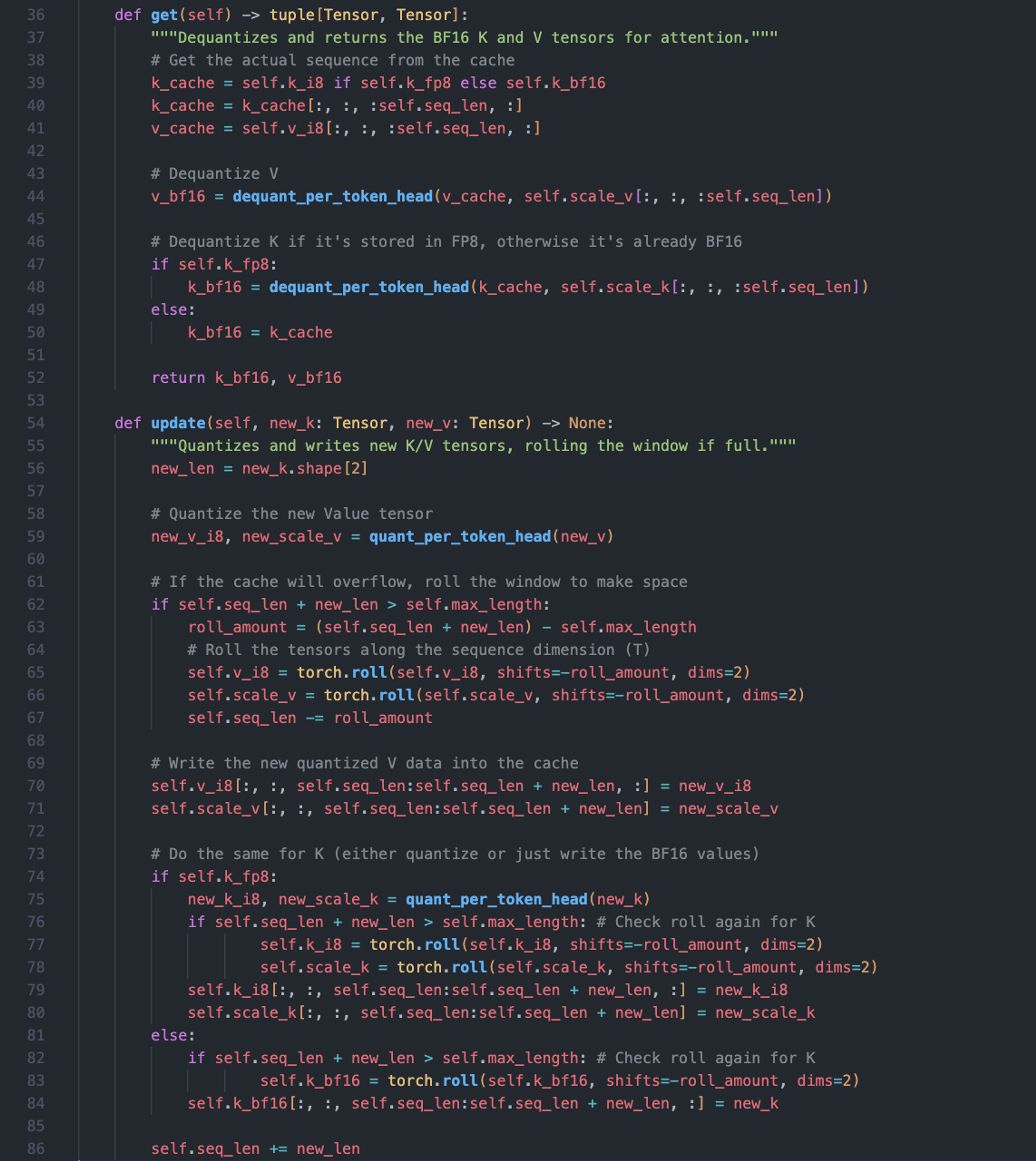These helpers are used within a cache class that abstracts away the de/quantization logic. The .get() method always returns high-precision BF16 tensors to the attention layer, while the .update() method handles the quantization for storage.